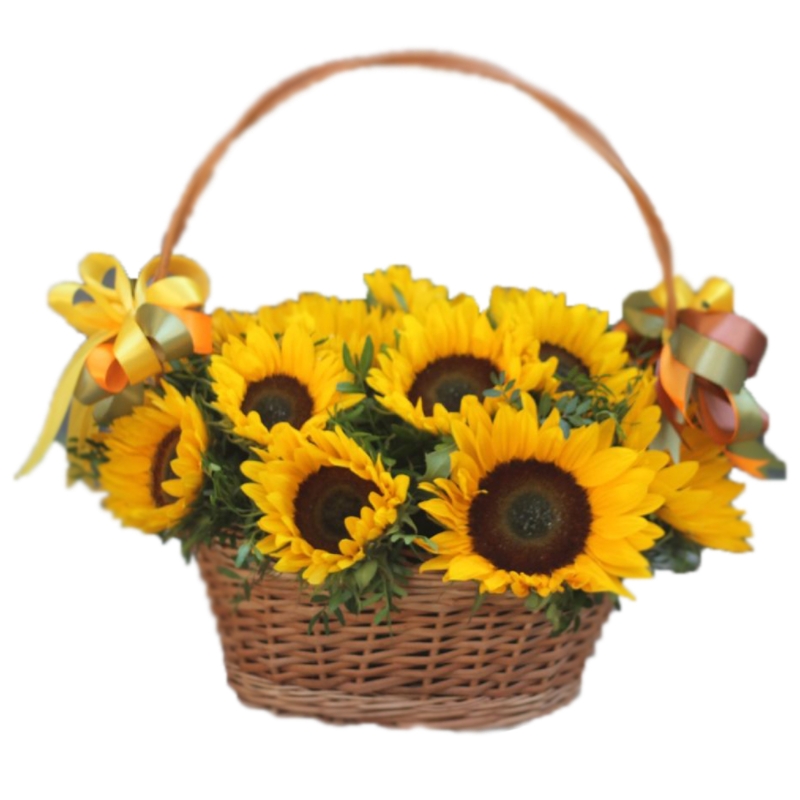 Букет состоит из 17 подсолнухов, зелень, корзина, оазис.