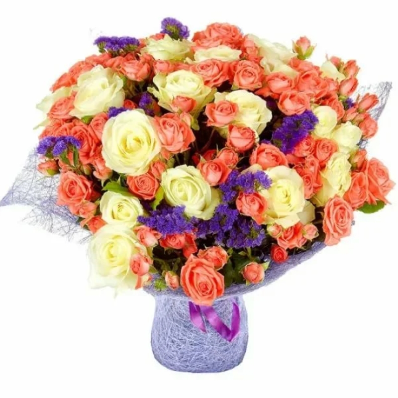 Букет состоит из 19 белых роз, 10 веток коралловых роз, 5 статица, упаковка, лента.